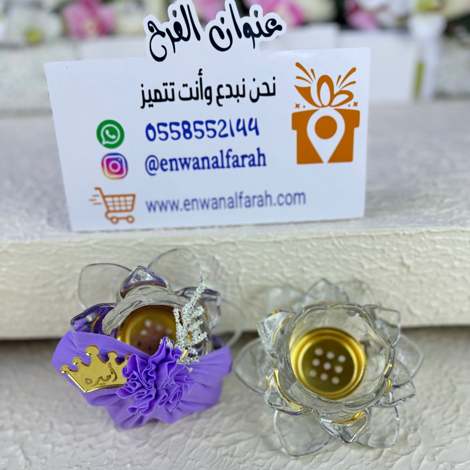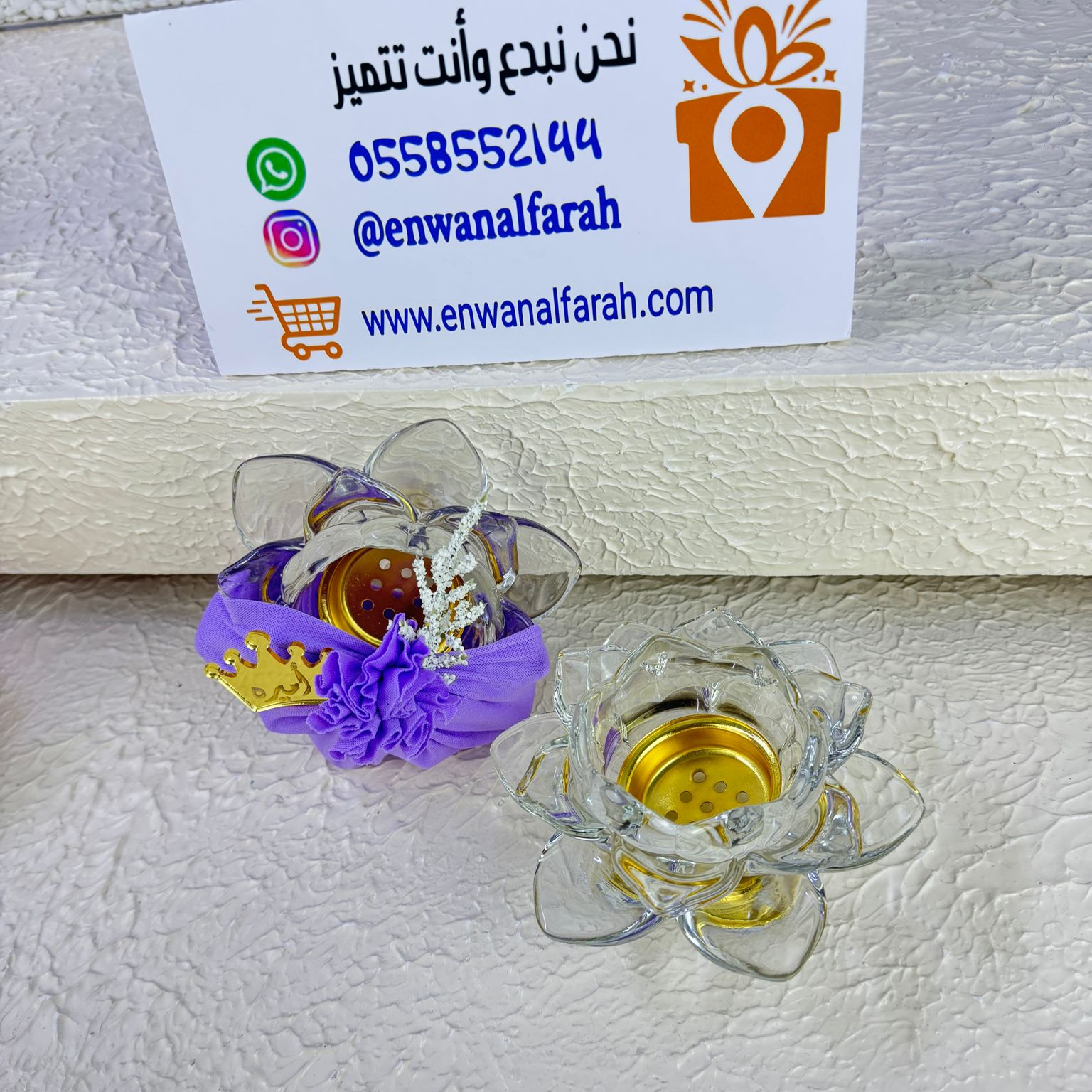 مباخر كريستال الورده مع تنسيق قماش وورد ولوجو بالاسم حسب الطلب