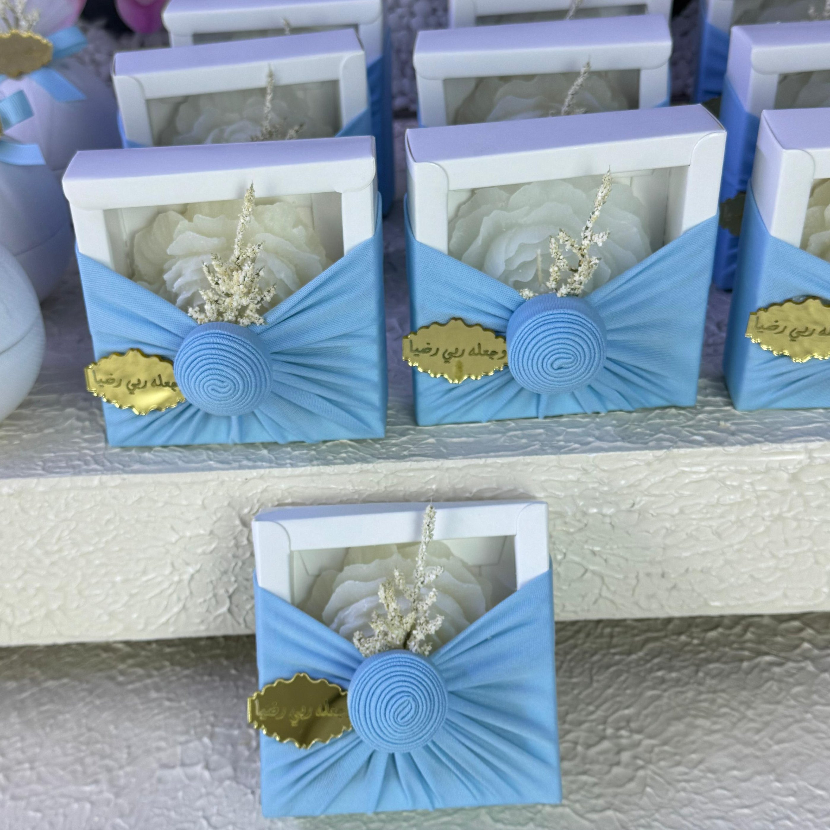 شموع ورده سكري مع تنسيق قماش وورد ولوجو بالاسم حسب الطلب